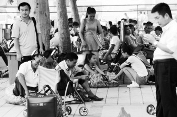 7月31日,在德州火车站,候车的市民坐在广场树荫下的地面上,躲避室内的闷热。