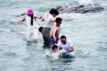 7月31日下午5点,在栈桥周边,5名游客因贪恋美景被潮水困在礁石上,该处虽离岸仅五六米,但海水较深处却已没过成人腰部,游客中一名儿童在回岸时踏空呛水,险象环生。在旁边一名摄影摊主的指引下,几名游客最终回到岸边,但已全身湿透。