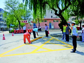 ▲工作人员在画禁停区域 记者 王帅 摄(资料片)