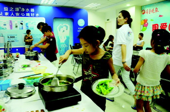 顺利购买食材后,孩子们还没来得及擦擦满头大汗,就开始忙着择菜、洗菜、切菜……在安利志愿者的组织下,孩子们井然有序、分工明确的开始做炒菜的准备工作。