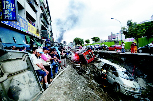 7月31日午夜,台湾高雄遭遇十多年来最严重的石化气爆事故,该市前镇区逾6公里长的数条街道因惊人的爆炸而塌陷碎裂。整个气爆影响范围约3平方公里,并引发强烈燃烧。搜救人员在清理现场时发现一辆汽车被震飞至三楼,可见气爆威力惊人。截至发稿,事故造成26人遇难、269人受伤,另有2人失踪。 新华社发
