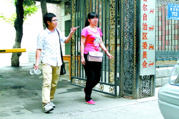 上岗首日,聊城大学志愿者刘玉普(左)步行到自治区民政厅上班。 本报特派记者 李军 摄