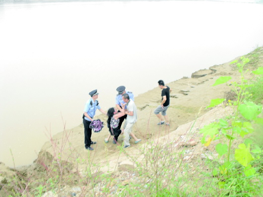 跳河女子被亲人和民警控制住。袁庆生 摄