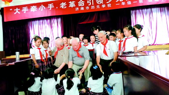 八一建军节这天,济南市历元小学的少先队员在杨萍班主任的带领下,来到济南军区第七干修所,开展了一场生动的“大手拉小手,老革命引领少先队向前走”的美德教育社会实践活动。