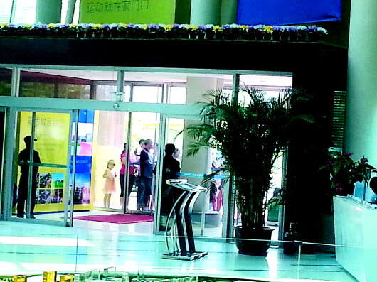 ▲从售楼大厅里可看到被挡在门外的老业主。
