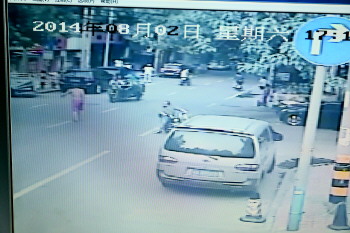 从警方提供的事发路口监控录像中记者看到,2日17时09分,光着膀子的张某出现在画面中,他手持两把菜刀,先是沿着马路边走,后折返大摇大摆走在了马路中间,在他后面一名骑自行车的路人见状立马反向离开。