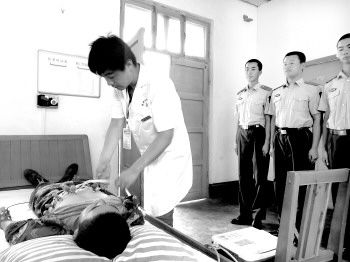 1日,菏泽市牡丹区人民医院的医护人员带着医疗设备,到营地为菏泽市武警官兵进行了一次义务健康检查。体检包括测血压、抽血、做心电图和B超检查等,为广大官兵提供了坚强的后勤保障。