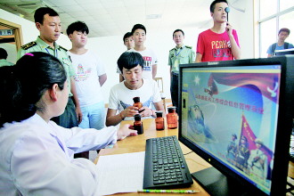 8月1日上午,环翠区人武部征兵体检站,一应征青年正在接受初检,当日,共有85名青年接受初检。目前威海2014年征兵体检工作正式启动,应征青年须接受眼耳鼻喉、口腔、内外科、血液、尿液、胸透等多项检查。