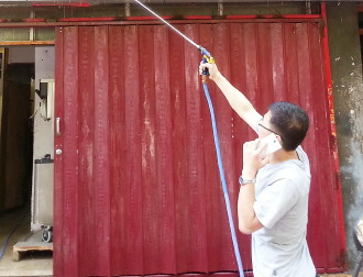 时间:2014年7月27日 自述:这位先生一手拿着冲洗枪冲刷墙面,一手拿着电话打电话。 点评:洗干净墙面,迎客来。