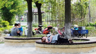 时间:2014年7月12日 自述:一对情侣在树下谈情说爱,一棵树下一人在休息。 点评:各忙各的互不干涉。