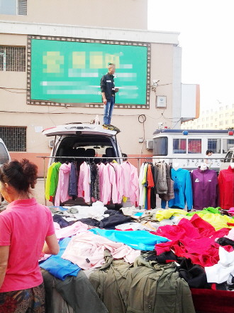 时间:2014年7月31日 自述:早市上,一商贩站在车顶上吆喝。 点评:这种“高大上”广告效果是不错,可得注意安全。