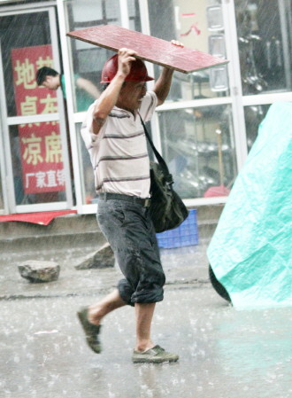 时间:2014年7月24日 自述:一场急雨让行人措手不及,这位大哥没有合适的雨具,只好举着一块木板挡雨。 点评:没有雨伞,木板来凑。