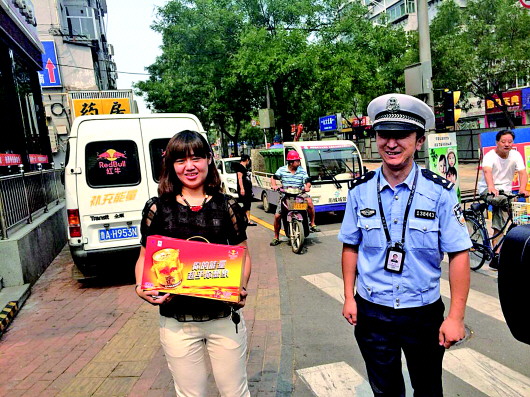 首期“最美司机”韩敏从“最美交警”惠淼手中接过奖品。 本报记者 崔岩 摄