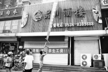 本报8月4日讯(记者 贺莹莹 杜彩霞) 本想利用暑假赚点外快,可是到了发工资的日子,老板却关门溜了。8月4日上午,三八路品川酒楼门前聚集了十几个学生,但是酒楼大门紧关,老板不见了踪影。据了解,该酒楼30余个员工未支付工资,而酒楼的十几个服务员都是兼职的学生。
