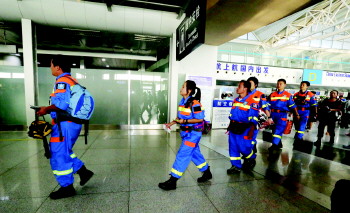 蓝天救援队队长李延照带队的第二梯队队员出发前往灾区。 吕璐 摄