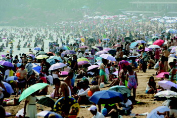 4日,在第一海水浴场,浴场游客爆满。 本报记者 张晓鹏 摄