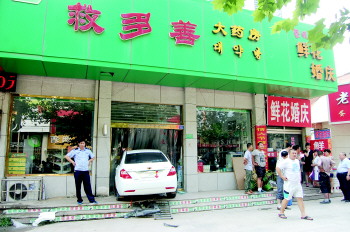 4日下午3点半左右,记者来到了苏州路车祸现场,看到一辆白色吉利帝豪汽车“停”在了一家药房的门口,车身前半部分已扎进药房。据目击者刘先生介绍,车祸发生在下午3点10分左右,当时这辆汽车以极快的速度自南向北行驶,来往行人纷纷避让,可是行至这家大药房附近时,司机突然向左猛打方向盘,汽车不偏不倚一头扎进了药房门口,出事后坐在副驾驶位置上的一名青年男子下车摘掉了车牌。“我当时正在收款,突然听到‘轰隆’一声,这辆车就冲了进来。”药房收银员小李回忆起当时的情况说,当时整个药店的人都吓懵了,所幸汽车撞到门口台阶后被卡住没有继续前进,否则后果将不堪设想。