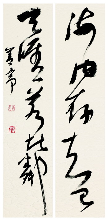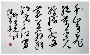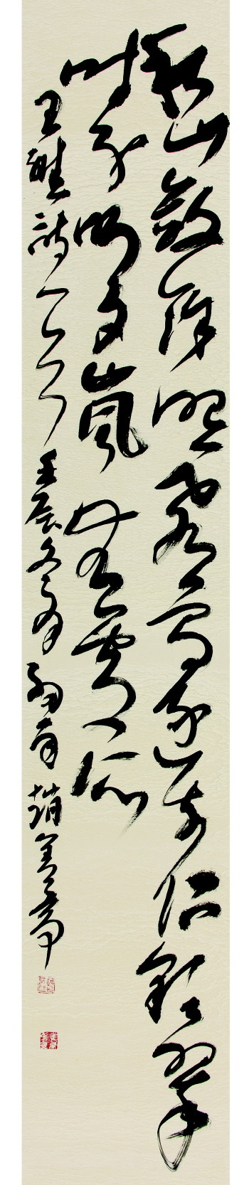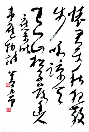欣赏赵善亭的书法艺术给受众留下最深印象的是蓄势待发,箭在弦上,势不可遏。你被他的书法线条不自觉地牵动着、引领着、撕扯着、呼喊着、欲罢不能,随着他的笔法、字法、章法、墨法走进了他的书法艺术世界里。赵善亭的书法艺术就是靠着他过硬的书法线条造势、强势。细细查看他的书法线条及其行列关系,不难发现有一条连续不断的“S”型曲线始终贯穿期间,稍细加拆分、剪切、分成若干小段即可看出又有若干微波曲线构成。这些线条丰富而生动,故康德曾说“线条比色彩更丰富”。古人称之为万岁枯藤是也。“字之体势,一笔而成,偶有不连,而血脉不断……”从笔势到时间节奏,从体势再到空间造型,再从笔势到体势去细细贯通,从时间节奏到空间造型去协调、统一,这都在平时训练的有素之中。