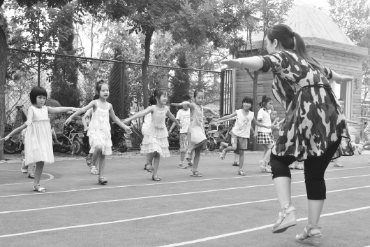 老师正带领幼儿做游戏,适应新的环境。 本报记者 谭正正 摄