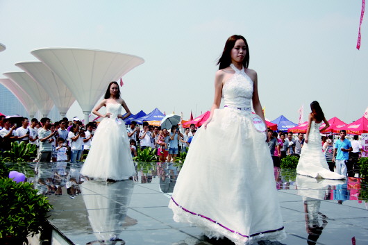 相亲会现场,滨州东方丽人模特空乘学校模特走秀吸引了众多单身男女青年。模特身穿的婚纱由情侣婚纱摄影会馆提供。