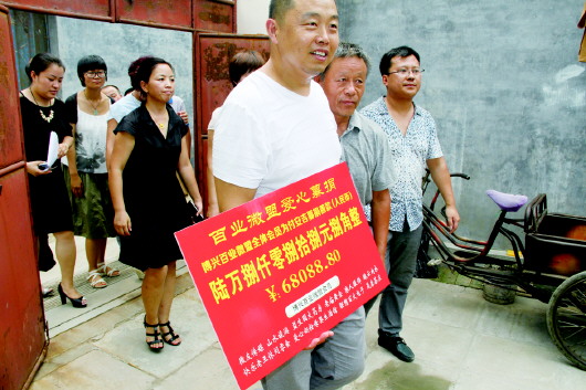 百业微盟工作人员和十家会员单位代表将募集到的善款送到小安吉家中。