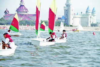 4日,威海市OP级帆船赛在市影视城海域圆满收帆,来自环翠区、经区、高区及荣成14所帆船运动进校园活动特色学校共计56名选手参赛。大赛共决出两个组别四个项目的冠军。图为小学组帆船选手扬帆竞技。