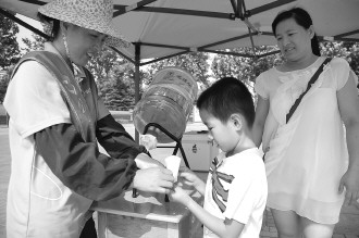 4日,在人民广场,园林部门在此设置了志愿服务纳凉点,免费为市民提供解暑药品,市民和游客还可以在此喝水休息。