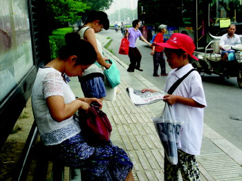 董子顺刚开始很羞怯,现在可以勇敢地向每个人推销报纸了。 本报见习记者 唐菁 摄