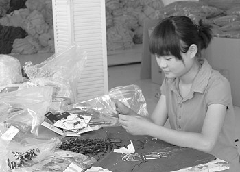 在服装生产车间,张玮玮将一个个吊牌组装起来,并用剪刀剪掉多余的线头,为成衣包装做好准备。“这些都是我做的,一天要做数千个吊牌。”