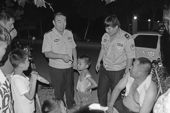 民警带着走失男童(中)寻找其家人。 本报记者 于鹏 摄