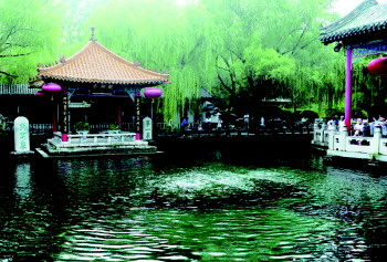 第一站选在趵突泉,已是下午六点左右了。趵突泉公园里游人如织,鲜花盛开,芳香扑鼻,泉水清澈,泠泠成韵,绿树婆娑,空气清新,一派春意盎然、万物复苏的景象。游完公园我们接着乘船游览大明湖,而且起点就从趵突泉开始。可以乘船从趵突泉到大明湖我是听说过的,为迎接全运会的召开,济南市政府斥资20多亿元将大明湖扩建并部分对外开放,将护城河疏浚贯通,购置了20艘游船供游客乘船欣赏泉城风韵。但我苦于没有时间,一直未能实现乘船的计划。