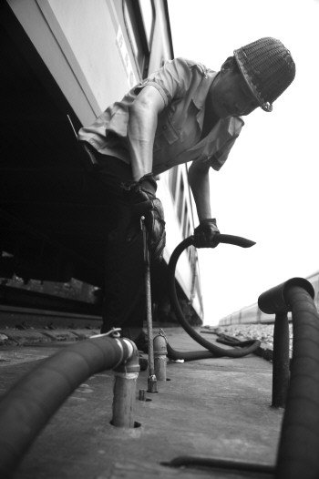 王卫东,兖州火车站给水乙班班长,由于常年在铁轨间劳作的他皮肤黝黑,短袖工作服袖口位置的皮肤上被晒出一道清晰的界限。中午12点04分,5024次列车缓缓停在兖州火车站1号股道,上下车的乘客们秩序井然,车上很多乘客正在吃饭或午睡,大都没有注意到王卫东和他班上的5名给水工。王卫东快步走到列车注水口边,熟练地将黑色胶管连接妥当,然后用工具打开水阀,清水便顺着管道进入了车厢的水箱内。