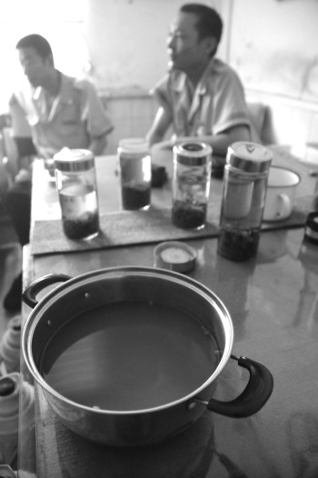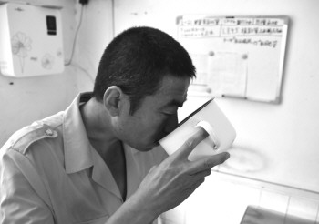 左:休息室内,大水杯和绿豆水是夏日必备。