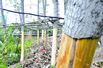 5日下午,记者来到奇山西街61号楼前的这片杨树林,发现原本围住杨树林的围墙被从中间开了一个小门,上面有锁,小门附近有几节被锯下来的杨树树干,从小门进去,可以看见被扒掉树皮的8棵杨树。