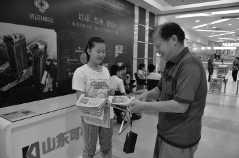今年12岁的杨文莉是即将升入初中一年级的一名学生。虽然年纪不大,但却是营销活动的一名“老人”了。因为这已经是她第二次参加营销秀活动。今天她总共领了60份报纸,拿起来都有些吃力。但她仍信心十足地表示一定可以完成任务,“前两天销售情况还不错,感觉今天应该也没问题!”