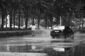 8月5日上午,于官屯大桥北三岔口右转弯处路段坑洼积水,车辆驶过后溅起水花,给行人带来了惊扰。 本报记者 王小会 摄
