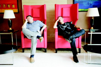 5日,在兴阳路与长城路交叉口处一酒店,两位客人不约而同地坐在酒店大堂内的沙发上休息,动作几乎一致,沙发和两旁的台灯、桌子也相互对称,让人看了忍俊不禁。