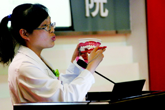 ◥医生正在讲解刷牙的正确方法。