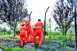 ▲高速公路的养护工人正在修补防护网。