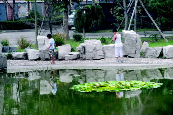 虽然中午刚有孩子落水,但仍有小朋友在湖边玩耍。 本报记者 王亚男 摄