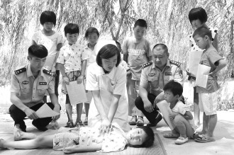 近日,台儿庄区泥沟镇开展“防溺水安全教育进村”活动,泥沟派出所民警向红旗闸边玩耍的儿童发放防溺水安全宣传常识,讲解防溺水安全教育,卫生院医护人员现场示范讲解了溺水急救常识。 本报通讯员 刘凤琦 李昱博 本报记者 白雪岩 摄影报道