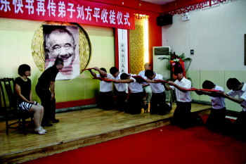 本报聊城8月5日讯(记者 孟凡萧 实习生 张石磊 通讯员 刘旭东) 鞠躬、跪拜、递拜师帖……3日上午,一场传统的收徒仪式在临清举行,作为山东快书非物质文化遗产传承人,山东快书高派再传弟子刘方平收下了张浩等七名弟子。这七人均是“90后”,其中6人为在校大学生,1人为在校高中生。