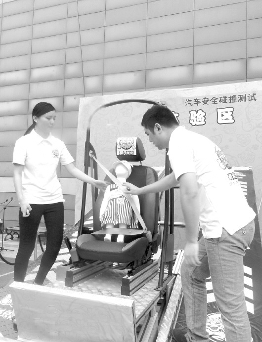 按照设定,主办人员随机挑选了几名市民进行测试,测试者坐在碰撞体验设备的座椅上,系好安全带,以平时抱孩子的方式把人偶娃娃平放在腿上。试验开始,设备以每小时25公里的慢速度滑行3米,与设备末端的栏板碰撞。