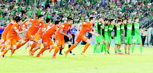 点球胜出,鲁能球员兴奋不已。 新华社发