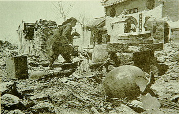 卡帕在台儿庄关帝庙附近拍摄的战后景象。