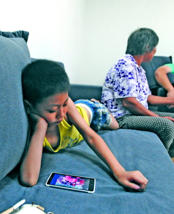 男孩被解救后在沙发上无忧无虑地玩手机,根本就不知道大人的担心。 本报记者 左庆 摄
