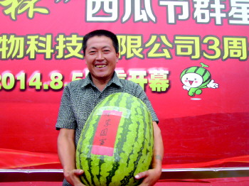 西瓜王李国富抱着自己的大西瓜。 本报记者 李贺 摄