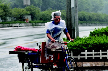 6日上午,在山东路上,一名骑三轮车的男子头顶塑料袋挡雨。