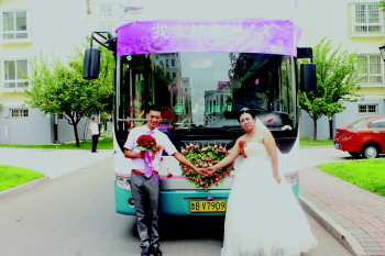 5日,胶州市胶莱镇孟家村的杨维方先生和刘艳女士喜结连理。既没有奥迪开路,也没有宝马护航,新郎新娘租来了四辆新能源公交车作为婚车。杨维方告诉记者,用公交车当婚车,既绿色环保,又简单大气。