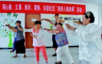 6日,竹岛街道同心路、东窑、文昌、海天、观海社区残疾人在老师的指导下学习太极拳。每周二、周五,同心路社区活动室都有残疾人免费健身课程,感兴趣的市民可报名参加。
